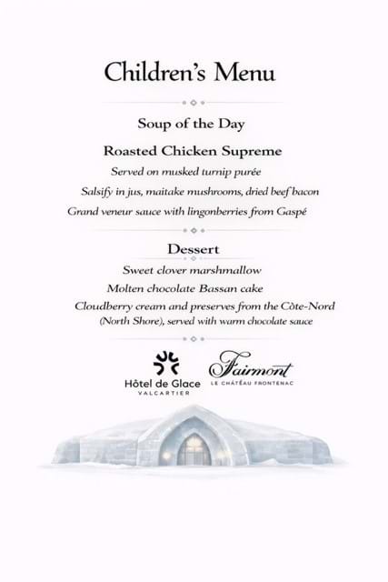 - A night at the Hôtel de Glace (ice hotel) does not include a meal at the Hôtel de Glace Restaurant