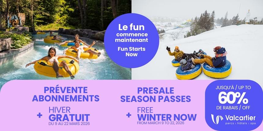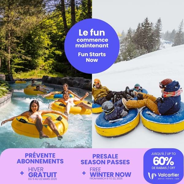 Nous avons le privilège d’être ouverts et de vous accueillir. Veuillez prendre note que la distanciation sociale de 2 mètres et le port du couvre-visage dans les files d’attente, dans les bâtiments et pour faire la visite de l’Hôtel de Glace sont obligatoires. Aussi, tous les visiteurs et vacanciers qui séjournent à Valcartier doivent réserver leurs billets à l'avance via notre site web. Merci de votre précieuse collaboration.