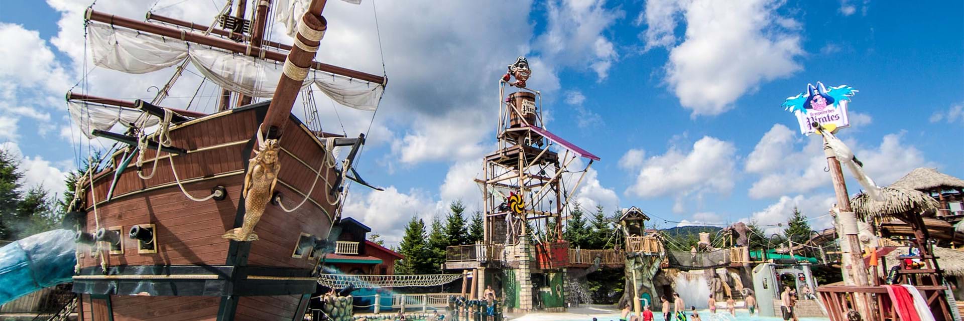 Moussaillons, entrez à vos risques et périls dans le légendaire Repaire des Pirates! Les aventuriers les plus redoutés des sept mers y ont jeté l'ancre de leur majestueux bateau. Vous voulez faire partie de l'équipage? D'innombrables toboggans et jeux d'eau mettront votre sens de la piraterie à l'épreuve. Arpentez les passerelles de bois à travers des arbres géants. Grimpez les cordages et glissez du pont jusqu'à la mer. Franchissez sans vous tremper la course à obstacles qui vous sépare de la rive. Marins d'eau douce ou vieux loup de mer, toute la famille trouve de quoi s'amuser au Repaire des Pirates!