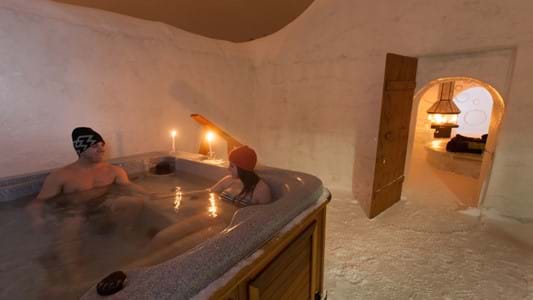 Offrez-vous du luxe dans une vaste et somptueuse suite de l’Hôtel de Glace comprenant foyer et spa privé. Pour célébrer une occasion spéciale ou tout simplement pour vivre de façon extraordinaire l'expérience d'une nuit nordique haut de gamme, optez pour l'élégance et la splendeur. Ce forfait comprend :