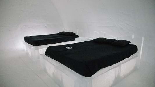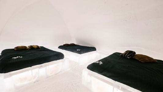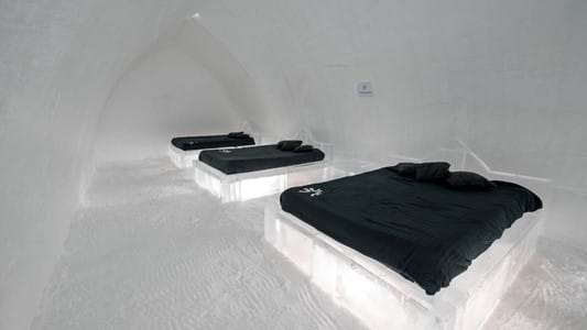 Épurée et naturelle, la chambre Hôtel de Glace représente l’expérience d’origine. Évoquant l’intimité de l’igloo, avec ses 3 lits Queen, offrez-vous le plaisir d'un séjour inoubliable jusqu'à 6 personnes dans la même chambre. Ce forfait comprend :