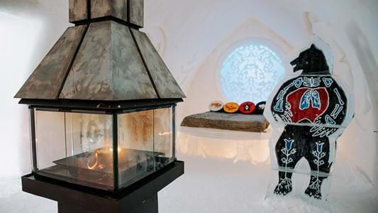 Épurée et naturelle, la chambre Hôtel de Glace représente l’expérience d’origine et évoque l’intimité de l’igloo. Ce forfait comprend :