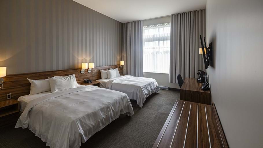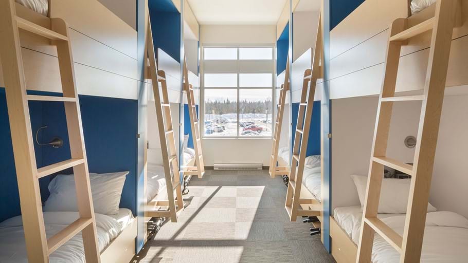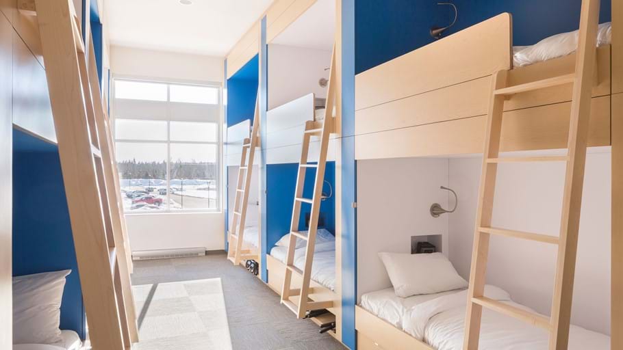 - Chambre style dortoir incluant 12 lits simples superposés dans une section privée de l’Hôtel Valcartier